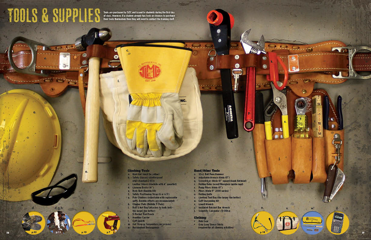 Most other training facilities show the tools that will be required for the training session by photographing a person wearing the toolbelt that contains all tools necessary for that training. I wanted to do something different, so we photographed the tools like this and used them as the centerfold, so to speak, in the catalog. Most of the tools could be featured much larger this way. The few tools required for the training that were not in the center spread, were mostly featured in the catalog as one of the graphic elements on the other pages, referenced in the circles at the bottom of this spread.